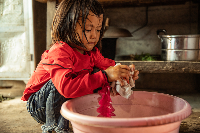 身邊沒有大人照顧,女孩小小年紀就開始學會(huì)做家務。