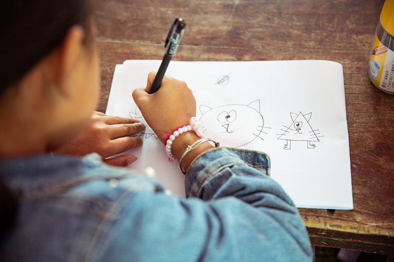 孩子們把自己腦海裏所想的都(dōu)畫在紙張上