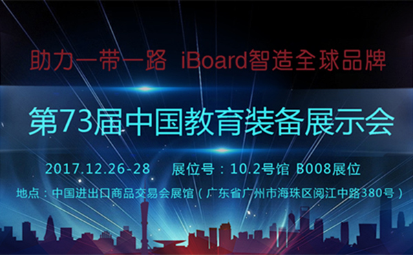 12月26日-28日在廣州(zhōu)琶洲(zhōu)國際會展中心舉(jǔ)辦的“第(dì)73屆中國教育裝備(bèi)展示會”將拉開序幕。蜜桃my.1688.com视频將以“助力一帶一路(lù),iBoard智造全球(qiú)品牌”為主題,充分展示出我司的新成果、新技術和...
