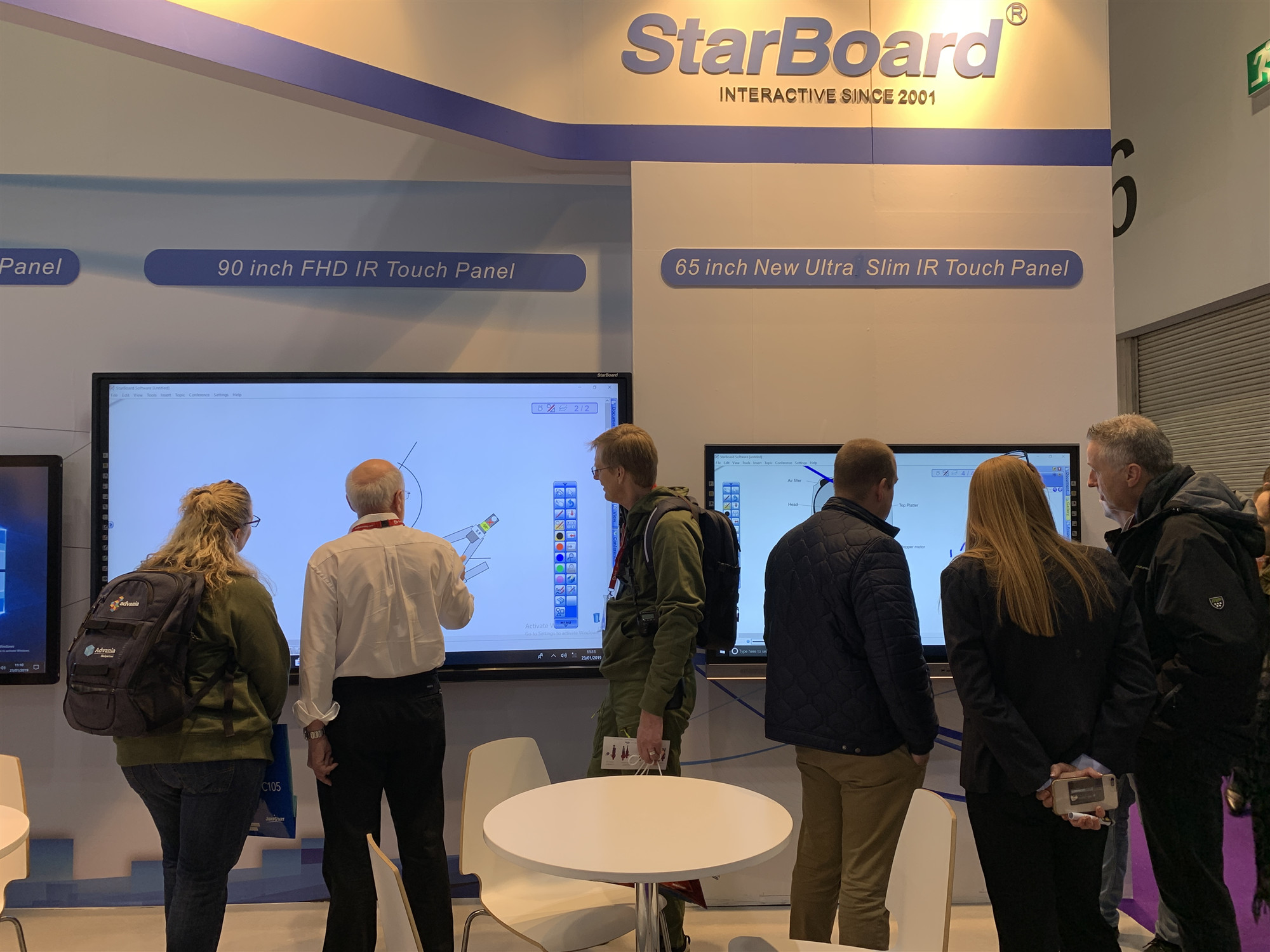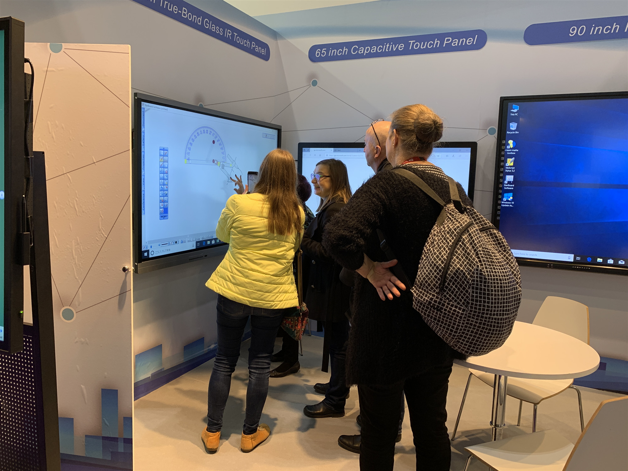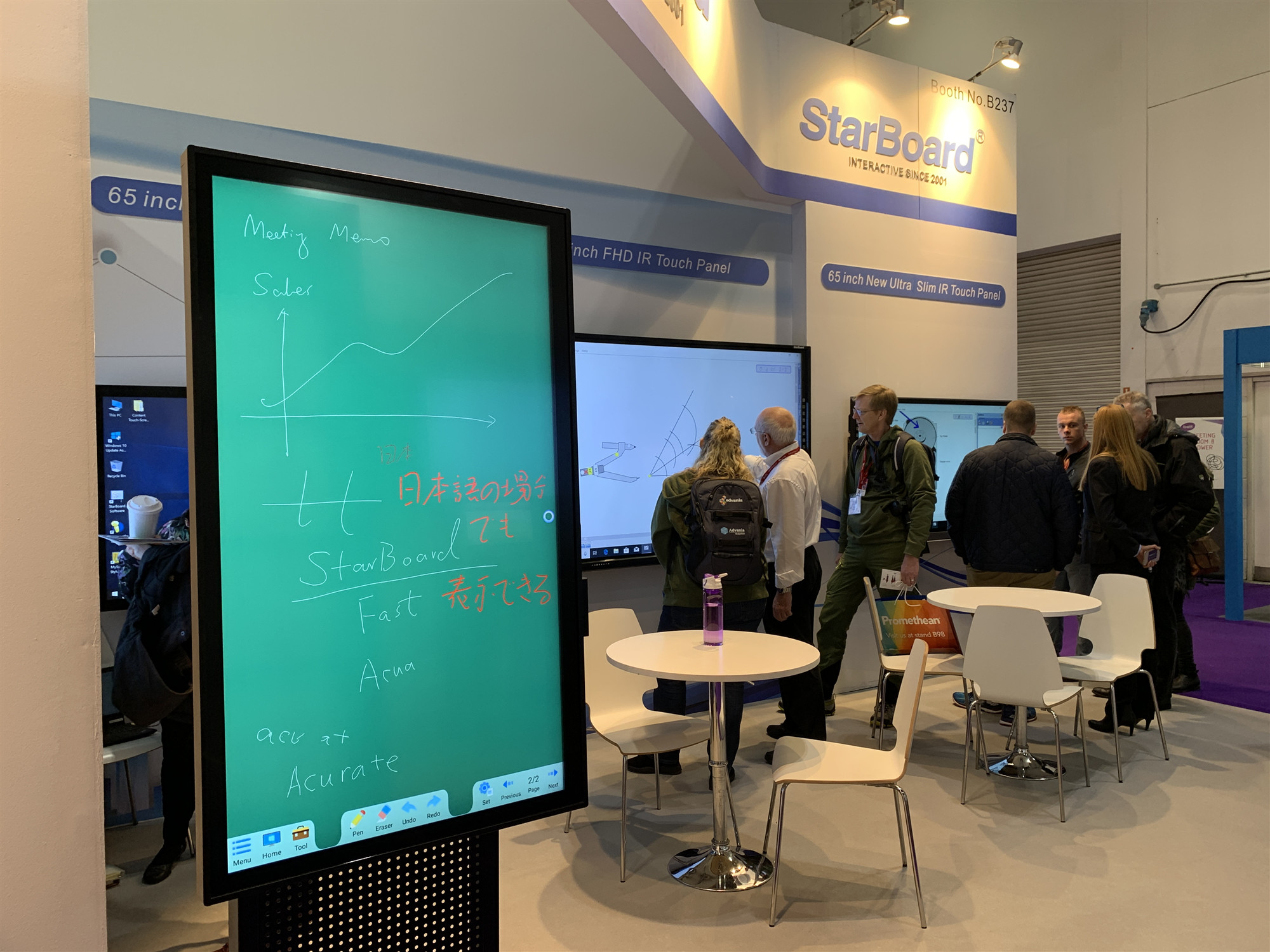 本次展覽,蜜桃my.1688.com视频股份帶來的新產品可謂(wèi)亮點多多。StarBoard展示了各種獨具特(tè)色的觸摸一體機。65”超(chāo)薄觸摸一體機采用紅外最新的觸摸算法,超低觸摸高度,做到超窄邊框,打破邊界局限,拓寬(kuān)了屏(píng)幕視野(yě);75”全貼合紅外觸摸一體機采用業內領先的紅外全貼技術多點觸摸技術,可視角度可達180度、書寫無距離、筆隨指尖(jiān)高速全屏連續書寫無延遲;90”高清觸摸一體(tǐ)機高(gāo)精度、分辨率高,色彩豐(fēng)富,支持細(xì)筆書寫,定位精準,還原更準確,給使用者不一樣的書寫體驗,吸引了(le)眾多(duō)觀眾前來體驗。