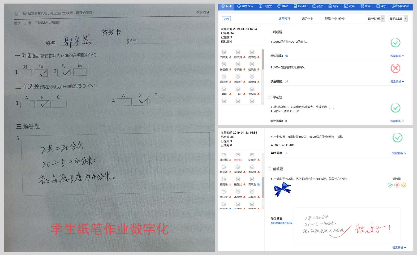 “紙筆作業”使用(yòng)傳統的(de)紙筆(bǐ)書(shū)寫(xiě)模式,不傷眼睛,學生在作(zuò)業上書寫完後,書寫筆會將內容同步數字化上傳到APP上,方便老師查看學(xué)生作業過程(chéng),並對作業內容進行批改。家長也能及(jí)時收到學生作業詳情,針對孩(hái)子的知識薄弱(ruò)點,推送對應的補救課程(chéng)。