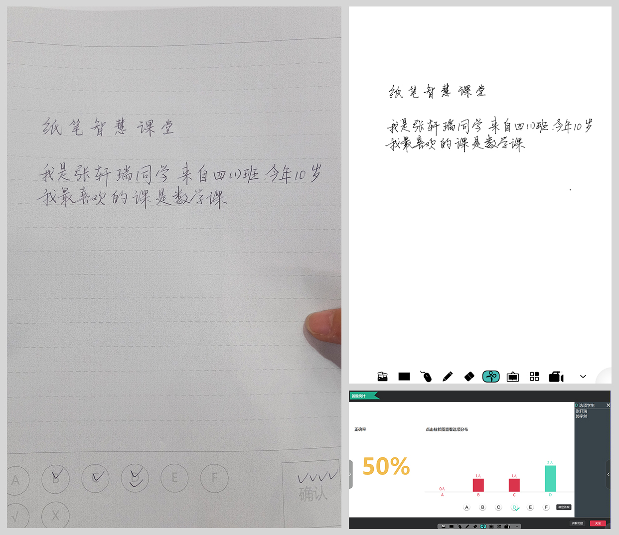 “紙筆智慧(huì)課堂”的互動性十分強大。教師精準上課,學生(shēng)實時反饋,根(gēn)據學生的學習情況,老師可以及時(shí)調整授課方式。使(shǐ)用APP,老師能(néng)將多個學生的(de)作品同步分享,還能進行搶答、抽簽等小遊戲(xì)活躍課堂氣氛。通(tōng)過老(lǎo)師與學生、學生與學生之間的互動,學習思維層層遞進,綜合素質評價貫穿整個教學場景。